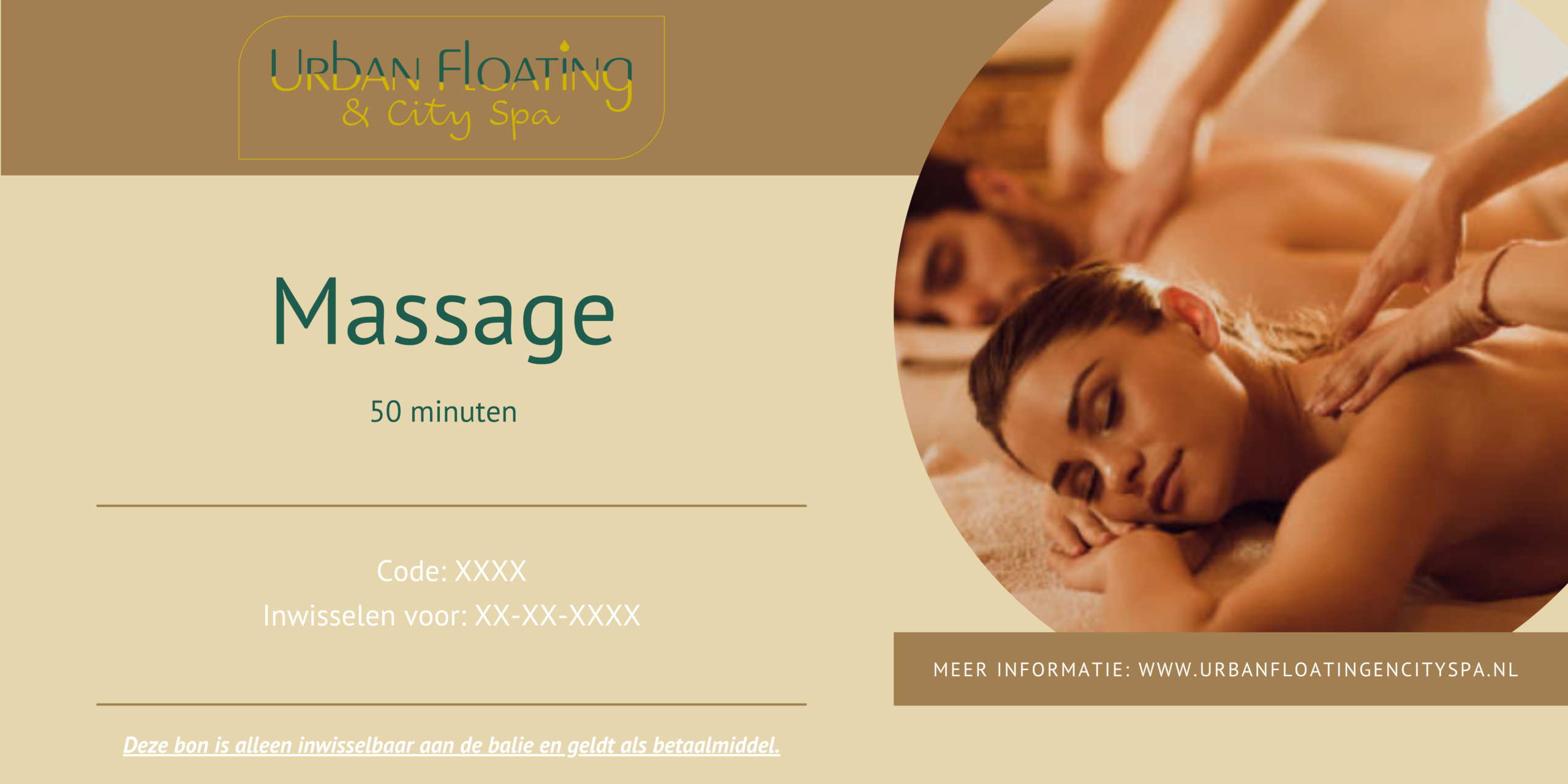 Deze cadeaubon / entreekaart  is tot twee jaar na uitgiftedatum geldig en kan alleen aan massages worden besteed. Het tegoed is niet inwisselbaar voor contanten en is uitsluitend inwisselbaar bij onze vestiging.